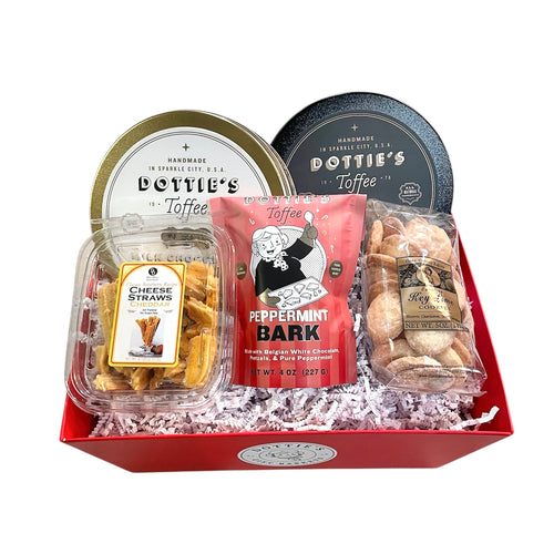 Dottie's Gift Baskets are hand-filled in Sparkle City, packed with the finest food gifts such as Dottie's signature milk or dark chocolate toffee, savory snacks from other local favorites, and much more!